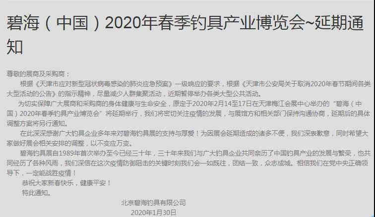原定于2月14-17日于天津梅江展覽中心舉辦的碧海(中國)2020年春季釣具產業博覽會宣布延期,具體開展時間待定。